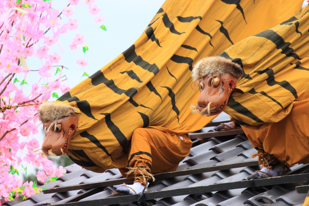 지붕 높이 오른 호랑이들이 강풍을 맞으며 춤추는 모습이 최고의 볼거리입니다. 지붕에 오르는 호랑이는 현지 중학생들이 연기합니다. 용맹하게 춤추는 호랑이를 꼭 직접 확인하세요.