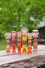 야지로 코케시의 특징은 베레모처럼 채색된 물레 무늬의 큰 머리와 물레 무늬가 많이 사용된 몸체에 있습니다.