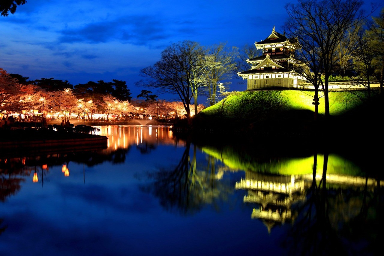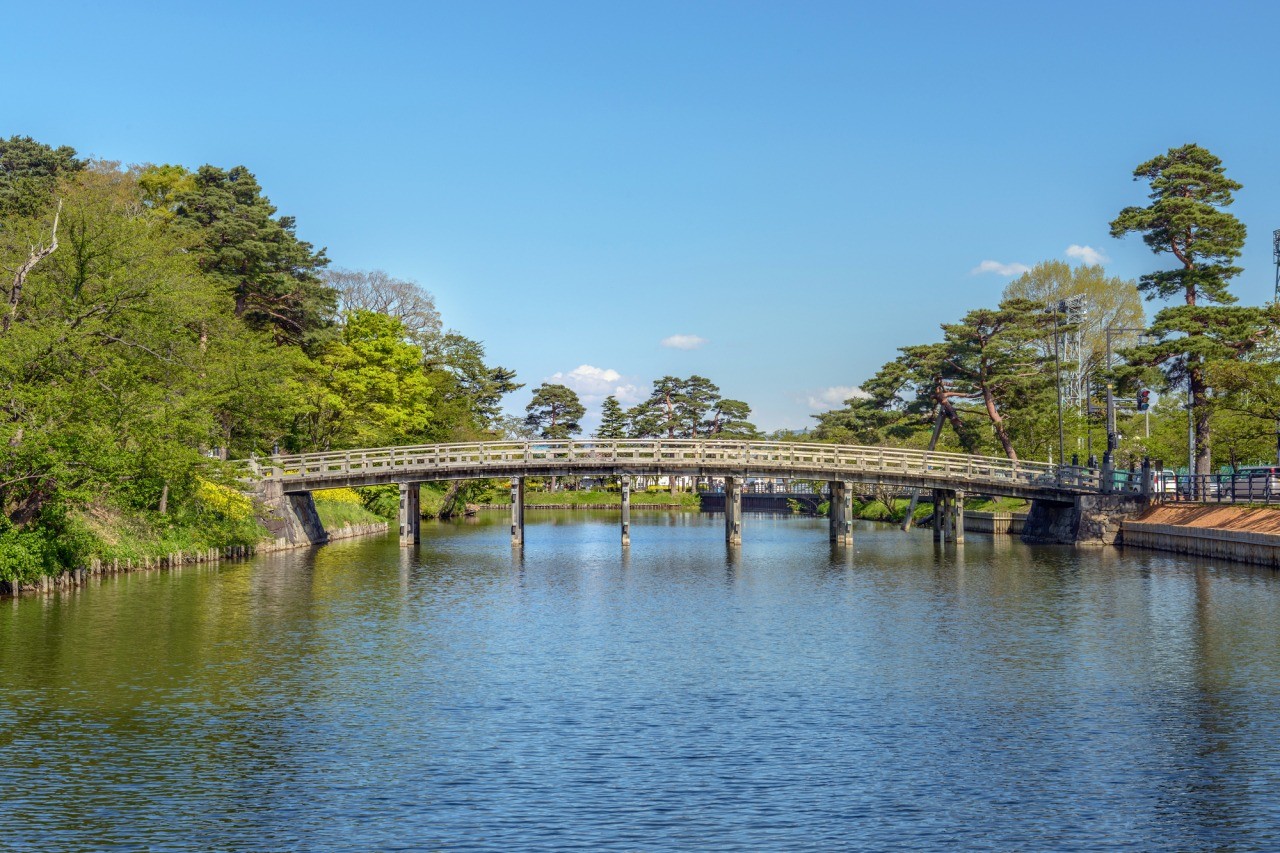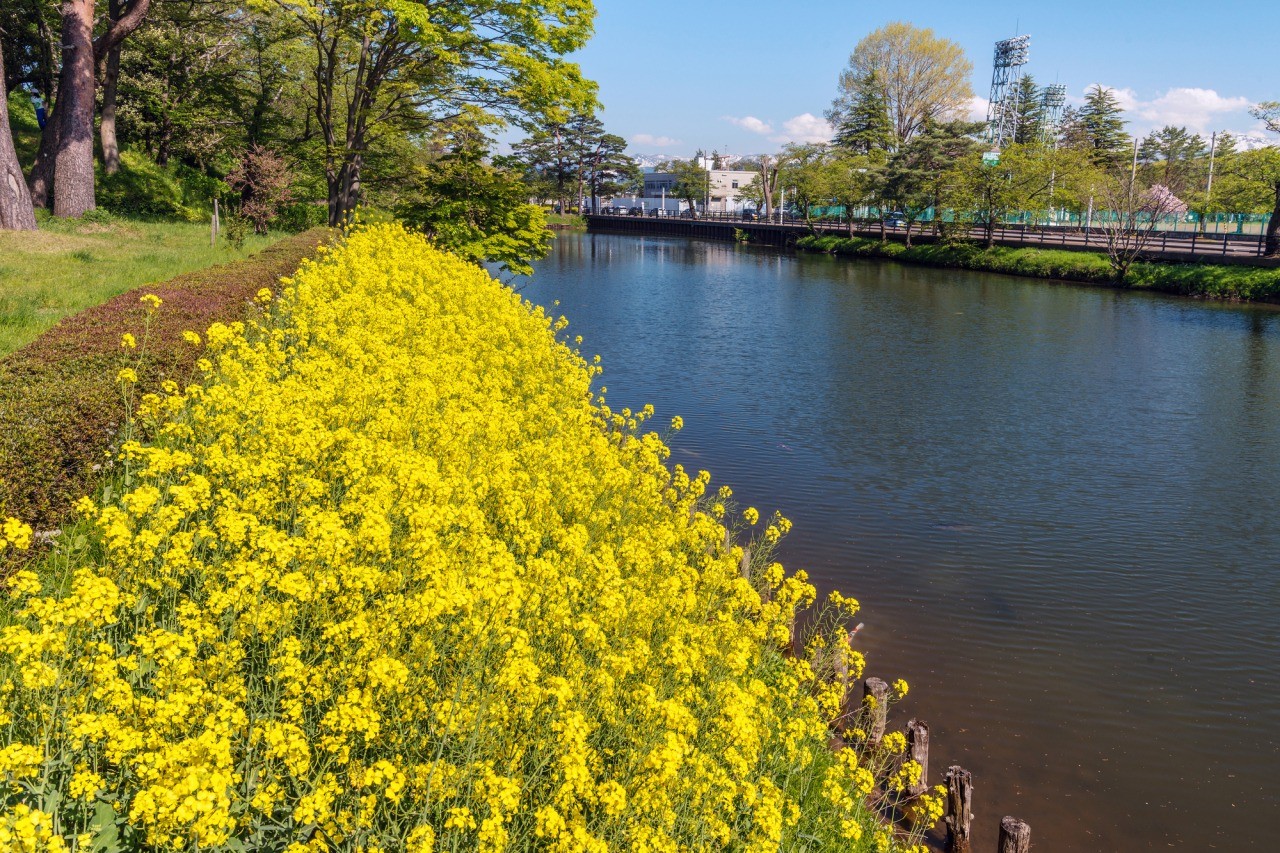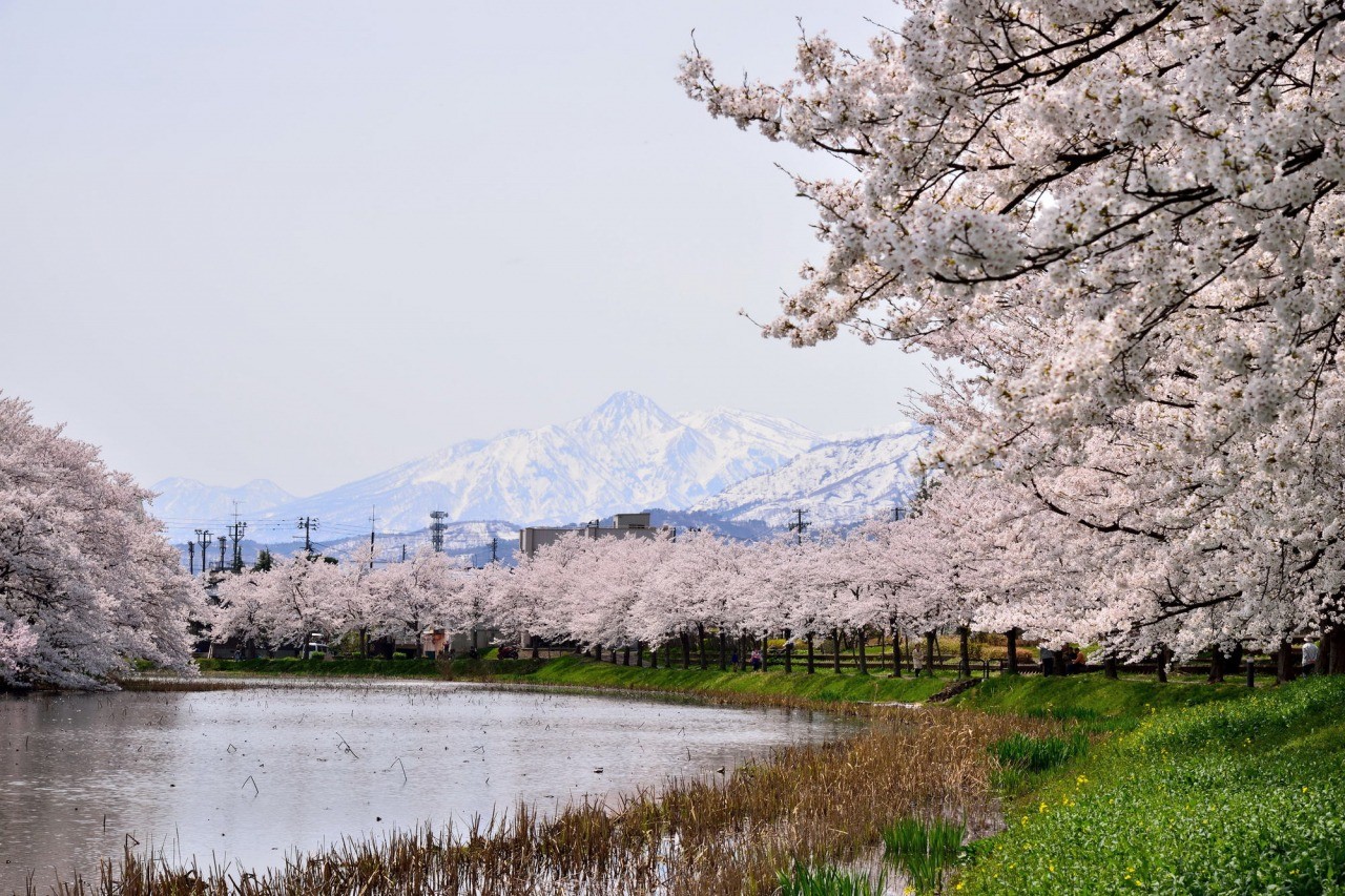 성터에 정비된 공원. 벚꽃 명소로 유명하며 봄에는 개화 절정 시기에 맞춰 ""다카다 성터공원 벚꽃 감상회""가 개최됩니다. 야간 경관 조명으로 불을 밝힌 벚나무 가로수 ""벚꽃 로드""도 인기입니다. 삼층 망루와 벚꽃이 작은 등롱 불빛에 빛나며 해자 수면에 비친 모습은 ""일본 3대 밤 벚꽃"" 중 하나로 손꼽힙니다.