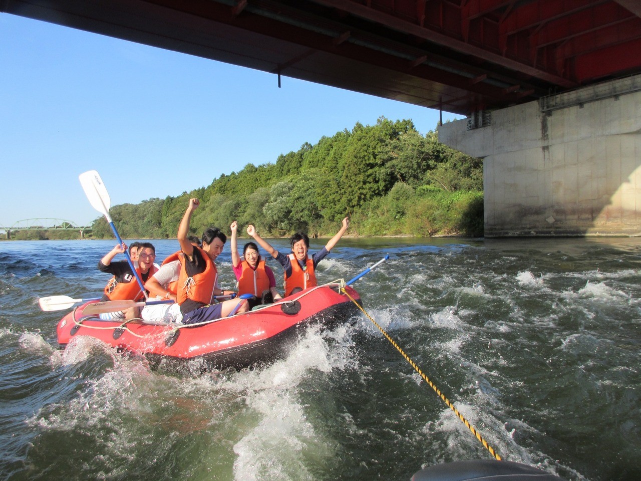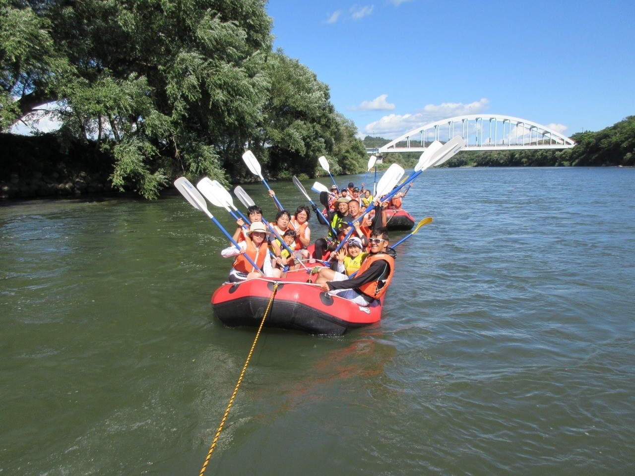 ①北上川遊覧…エンジン付きのゴムボートで北上川の流れを体感。自然の美しさと危険をインストラクターが指導します。