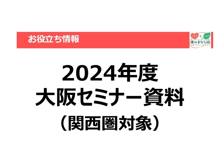 東北教育旅行セミナー【大阪会場】【2024年度】 とうほくきょういくりょこうせみなー【おおさかかいじょう】 2024.8.20開催 「東北教育旅行セミナー」【大阪会場】の資料を掲載しました。 2024年8月20日に開催した「東北教育旅行セミナー」【大阪会場】のプレゼンテーション資料です。 東北地方や各県の教育旅行情報、移動手段情報として、是非ご参考ください。 カテゴリー お役立ち情報 写真をすべて見る ダウンロードはこちら 印刷用ページを見る