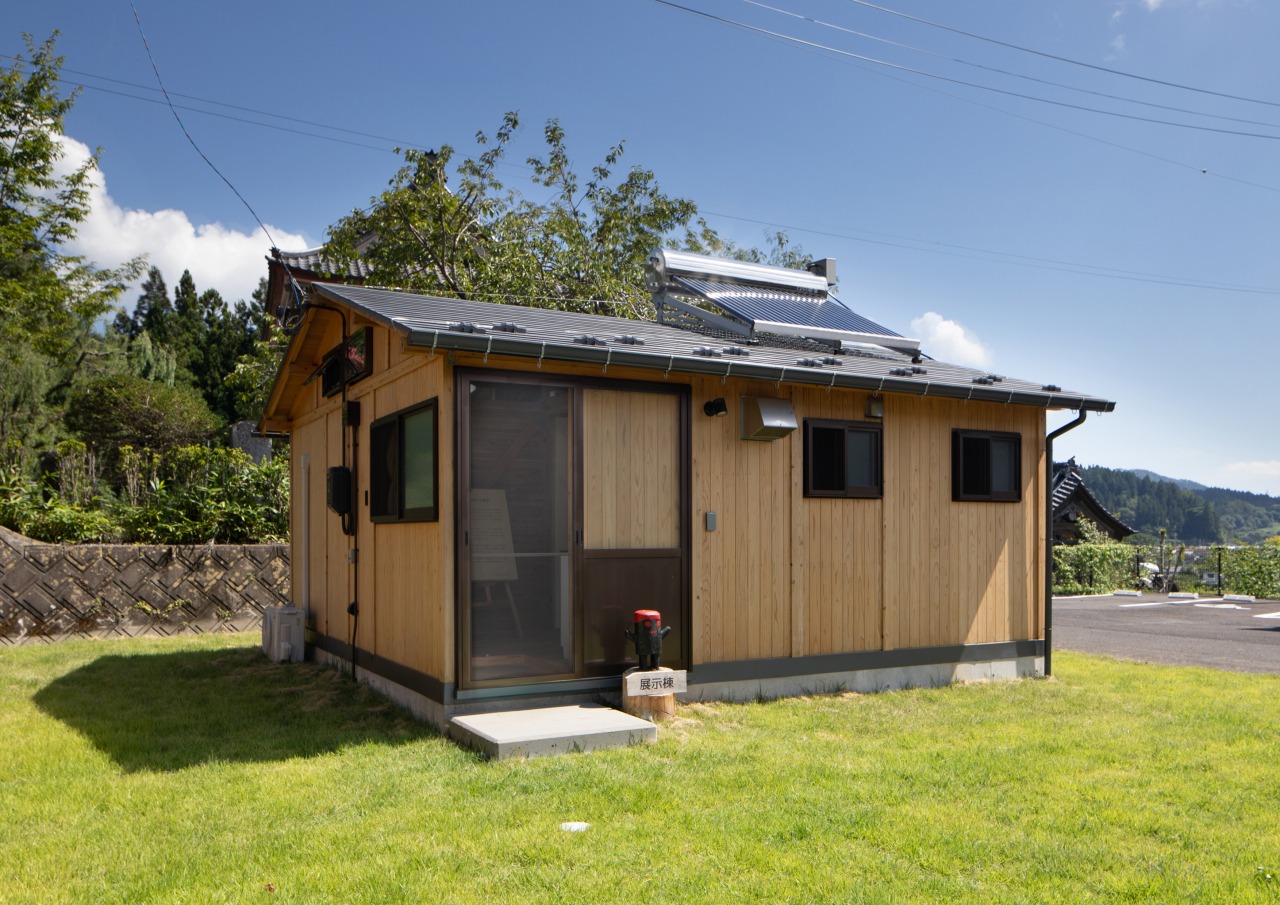 シゴトトマナビフクゴウシセツ「イコウェルスミタ」テンジトウ建設当時の部材や支援された物品等を使って外観、内装を再現した木造一戸建ての仮設住宅です。