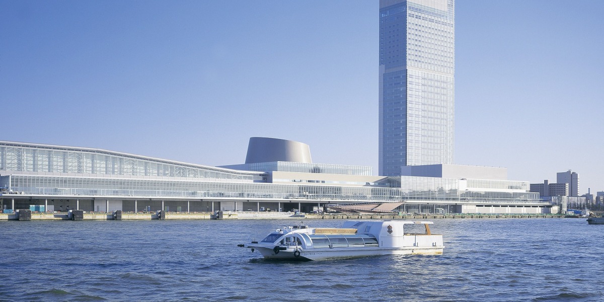 信濃川が日本海に注ぐウォーターフロントに位置する複合コンベンション施設、朱鷺メッセ。船をイメージした建物のシルエットは水面に美しく映え、スケールの大きな洗練された都市景観を形成しています。