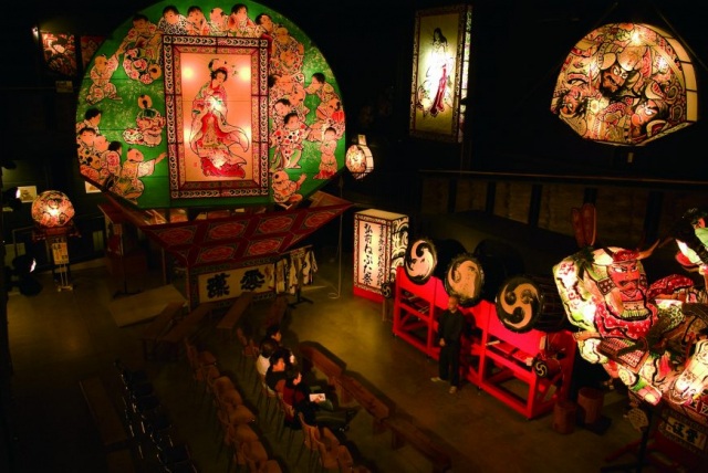 青森ねぶたが歌舞伎風の人形の灯篭なのに対して、弘前ねぷたは扇形が主体です。弘前ねぷた館では高さ10mの大型ねぷたと内部の骨組の見学や、笛や太鼓のお囃子を鑑賞します