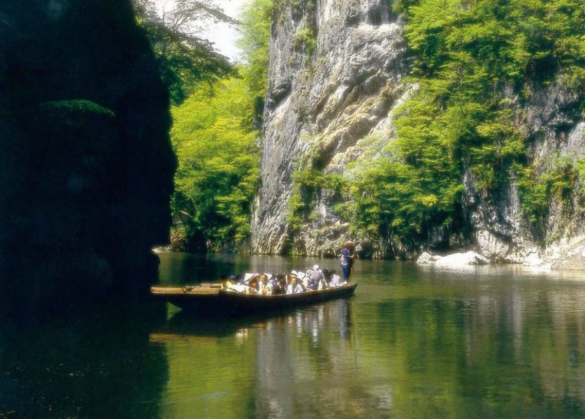 猊鼻渓は高さ100mを超える絶壁が続く、全長約2kmの渓谷です。船頭が棹一本で巧みに操る舟に乗り、そそり立つ岩の間を流れる川を、約1時間30分かけて下ります。