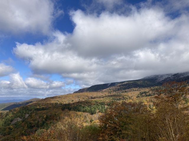 にしあづまスカイバレーのこうよう西吾妻スカイバレーは山形県側米沢市の名湯白布温泉から、福島県側北塩原村桧原湖までの全長17.8Kmに渡る山岳観光道路で、ヘアピンカーブの連続で白布峠の南側は東鉢山七曲りと称する芸術的なカーブが続き走行時には注意が必要ですが、目の前には見事な景色が続きます。