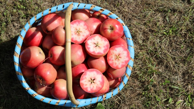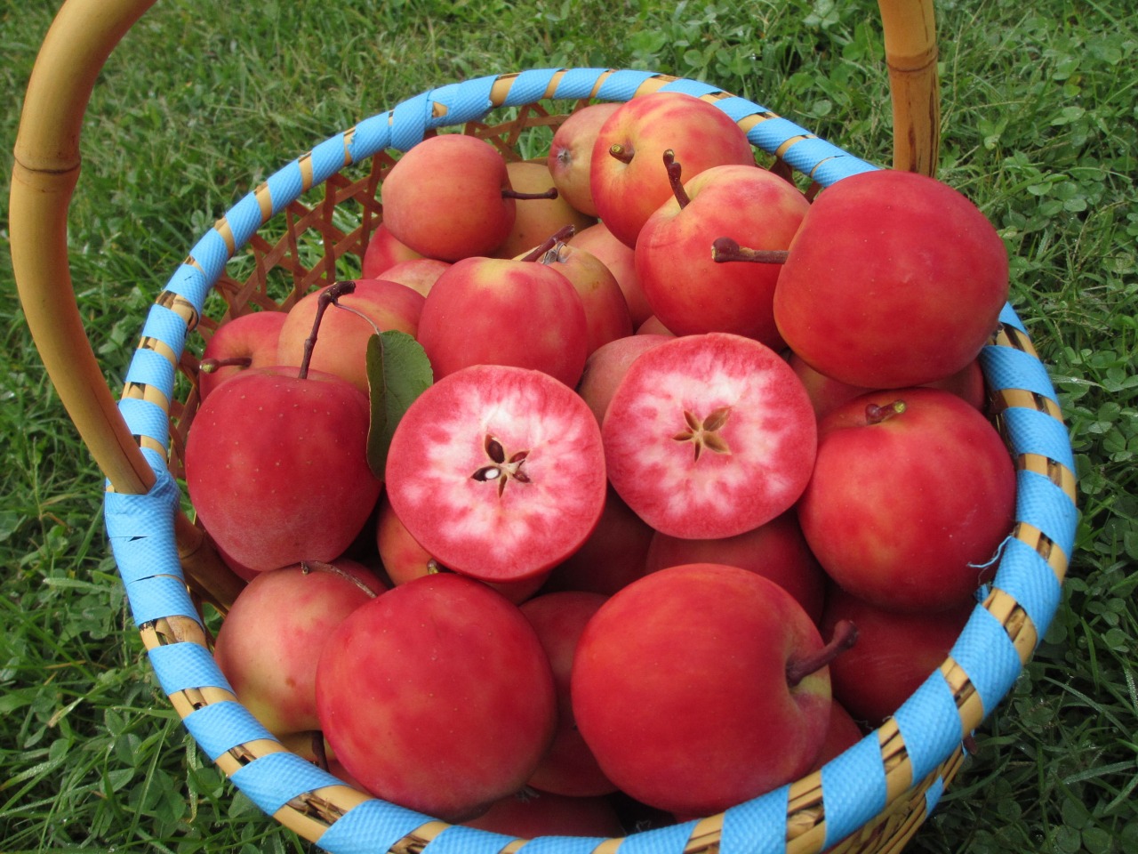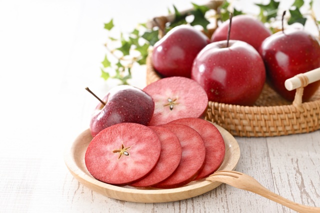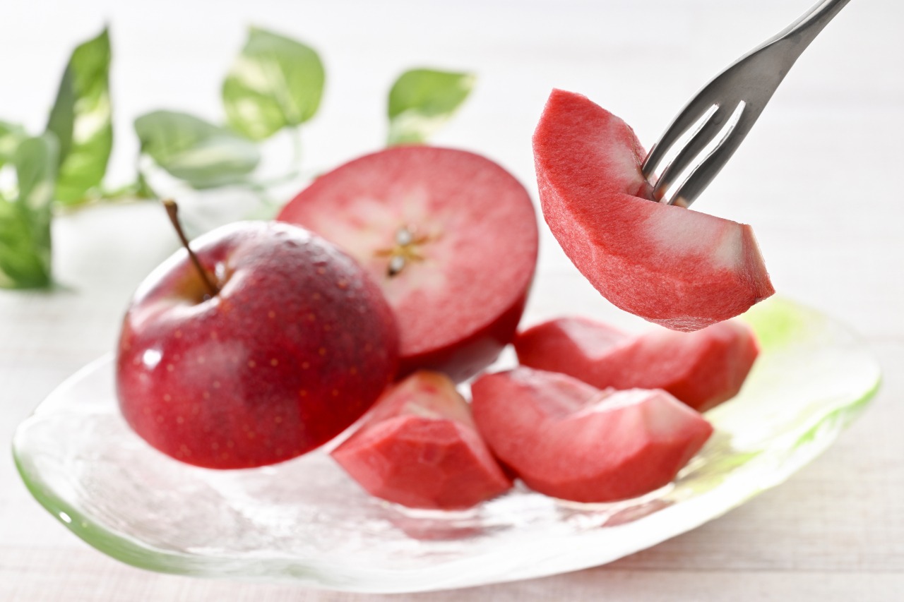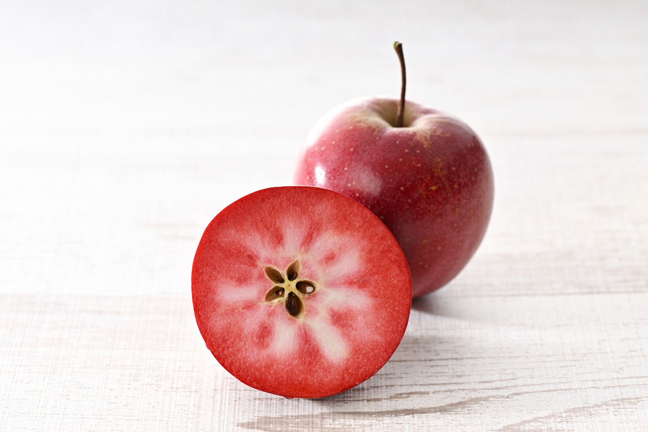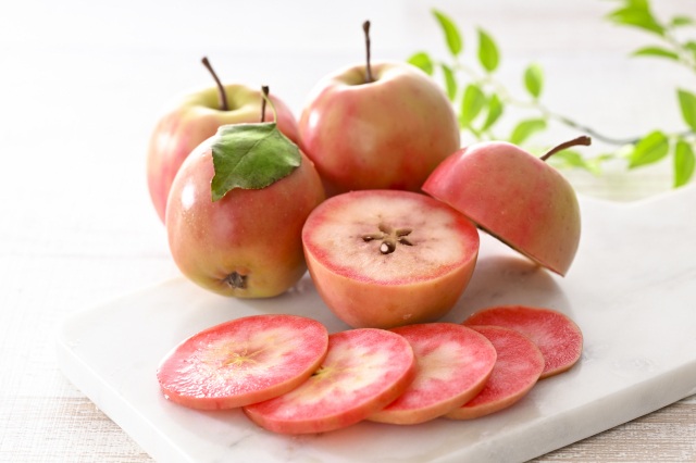 あかーいりんご「赤~いりんご」は、果皮だけなく果肉や花、葉、枝までも赤いという、世界的にも珍しい特徴を持つ五所川原市特産のりんごです。