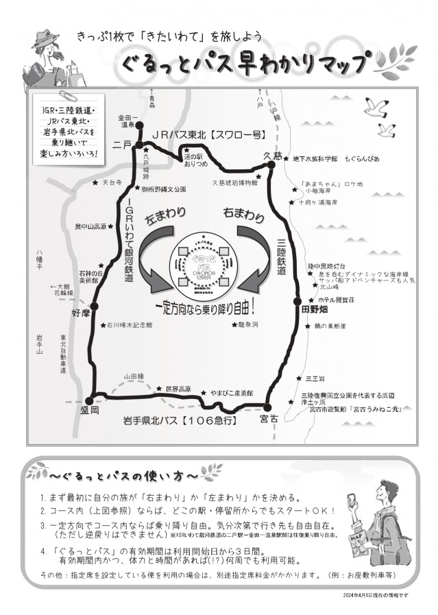 きたいわてぐるっとぱす以下の路線を一方向に限り、どこから乗っても何度でも乗り降り自由となります。