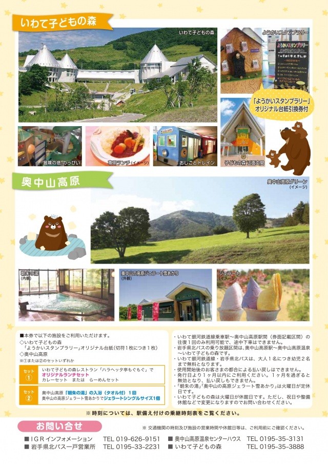 あいじーあーるいわてぎんがてつどう おくなかやまこうげん こどものもりきっぷ電車+バス+スタンプラリー用紙+【ランチ】または【温泉】がセットになったお得なきっぷです。