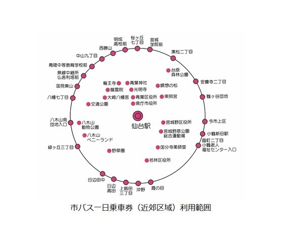 せんだいし 【 しばすいちにちじょうしゃけん 】市バスの市内区域全線、近郊区域内全線を1日何回でも自由に乗り降りできます(るーぷる仙台と楽天シャトルバスでは利用できません)。バス車内での販売はしておりませんので事前に定期券発売所でご購入ください。