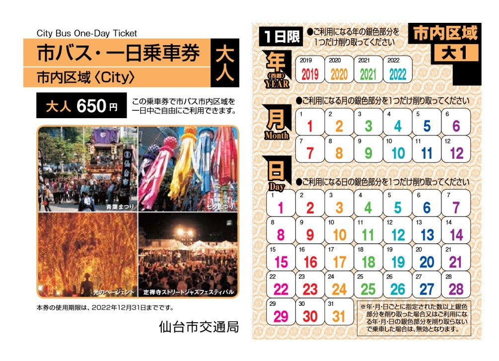 <市内区域券(仙台駅から260円区間内全線通用)>