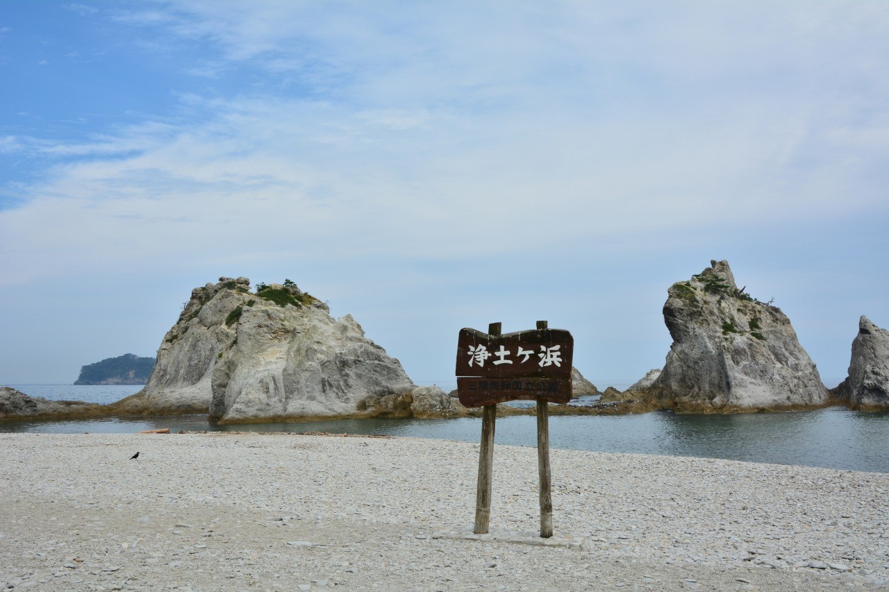 净土滨位于三陆复兴国立公园——三陆地质公园内。翠绿色的松树挺立在火山岩的白岩和小石形成的海湾,如日式庭园般美丽,是日本国家指定名胜。以前来访此地的僧侣曾感慨“犹如极乐净土”,因而得名净土滨。