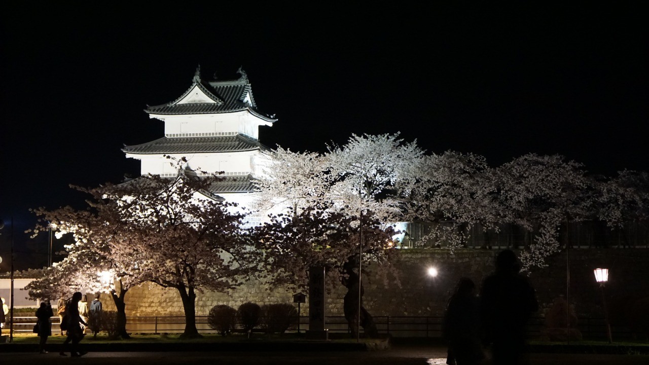 樱花盛开时节会设置纸罩蜡灯,还可在夜间赏樱。倒映在护城河里的夜樱及点亮彩灯的城堡相映成趣。