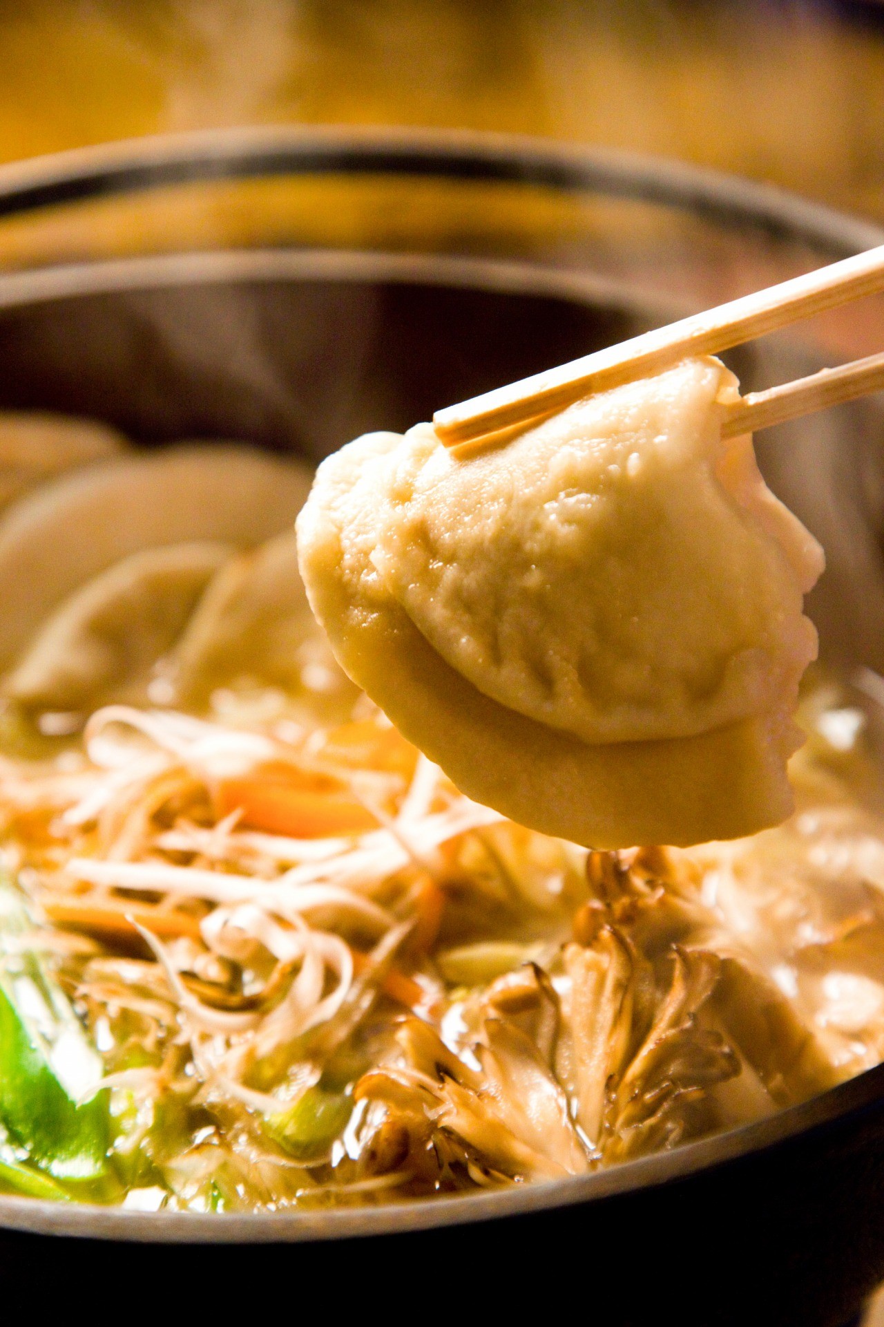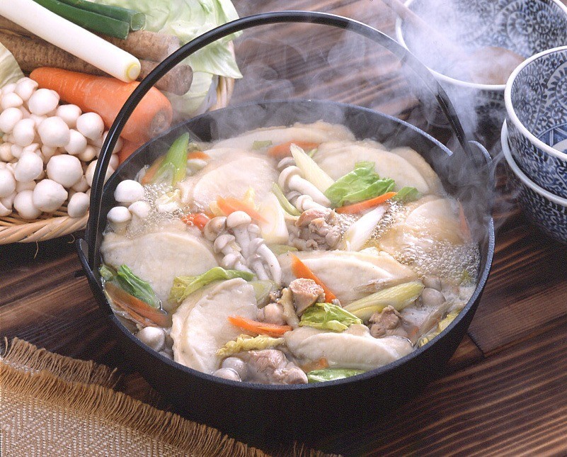 在雞湯或鯖魚湯中加入時蔬、豆腐及特製的南部煎餅煮熟,即是八戶地區自古以來的代表性地方料理-八戶煎餅湯。不僅口感軟嫩彈牙,還能嚐到煎餅的鮮味。八戶煎餅湯在2007年時入圍地方料理百選。