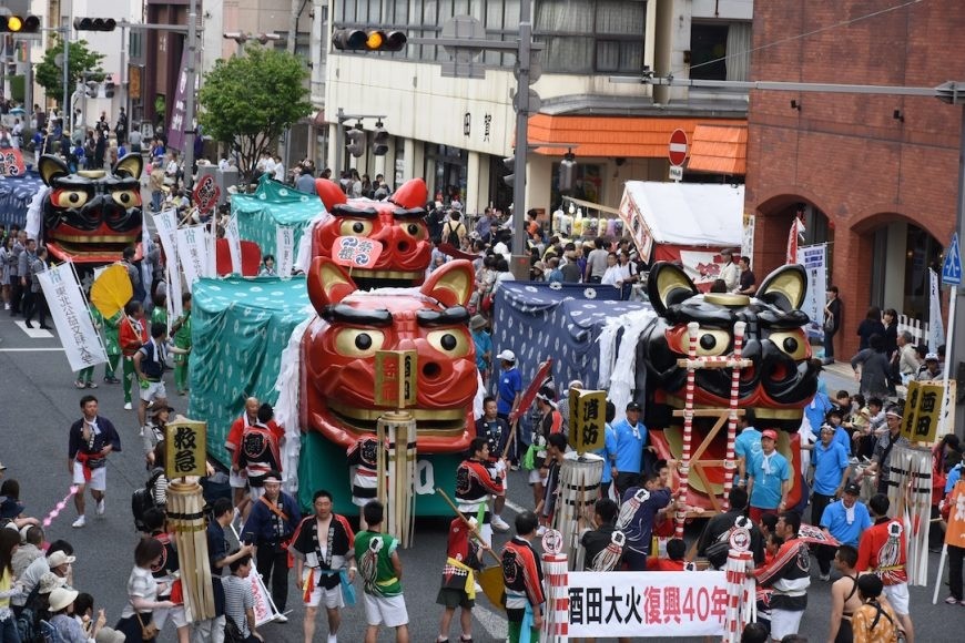 酒田祭 花車及將小朋友一口吞下的巨大獅子! 每年5月19日~21日舉辦。作為上下日枝神社的例行祭典「山王祭」,從1609年起持續舉辦,歷史悠久。 20日主要祭典中的花車遊行值得一看,長寬2公尺、胴體高10公尺的4隻巨大獅子花車震撼力十足。還能看到小獅子及可愛的獅子寶寶等,獅子一家在街區巡行。「獅子吞」活動則是為了祈求祛病消災,把小朋友送進獅子花車嘴裡,備受歡迎。獅子吞活動舉辦地點、時段有限,不妨先上酒田市官網確認後再出發。 如果想進一步享受酒田祭樂趣,不妨參加19日晚間舉辦的宵祭。高22公尺的立山鉾花車點亮,震撼力十足,風情與白天截然不同,七彩繽紛。花車在酒田小調的笛聲、鼓聲中巡行,是活動最大亮點。 區域 山形縣 酒田・鶴岡・庄内 觀看照片 列印 儲存我的計劃 移除我的計劃 基本資訊 地址 山形県酒田市中町 交通 ●從JR酒田站步行約15分鐘或搭乘公車約7分鐘 ●下山形自動車道酒田中央IC後約10分鐘 停车场 請利用希望HALL、酒田市體育館及付費停車場。 举办期间 每年5月19日到5月21日 会场名称 山形縣酒田市中町等處 洽詢單位 联系方式 酒田觀光物產協會 电话号码 0234-24-2233