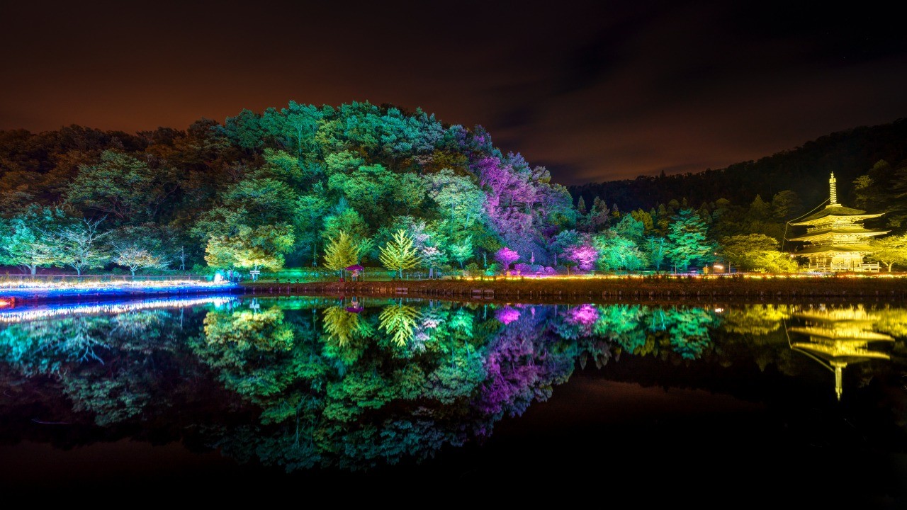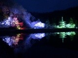 ภาพของเจดีย์สามชั้นและซากุระที่ประดับประดาไฟสวยงามที่สะท้อนลงบนผิวน้ำ คืออีกหนึ่งไฮไลท์ที่ห้ามพลาด