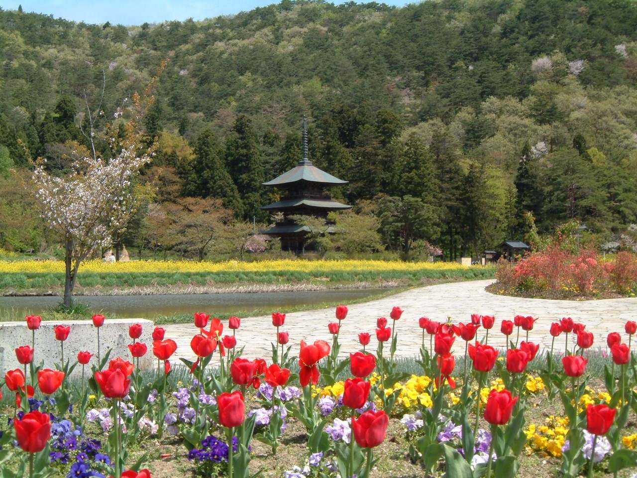 หากออกมานอกอาณาเขต และมองดูพื้นที่ทั้งหมดจากระยะไกล คุณจะเห็นทัศนียภาพอันงดงามของดอกซากุระ ดอกนะโนะฮานะ และดอกไม้อื่นๆ