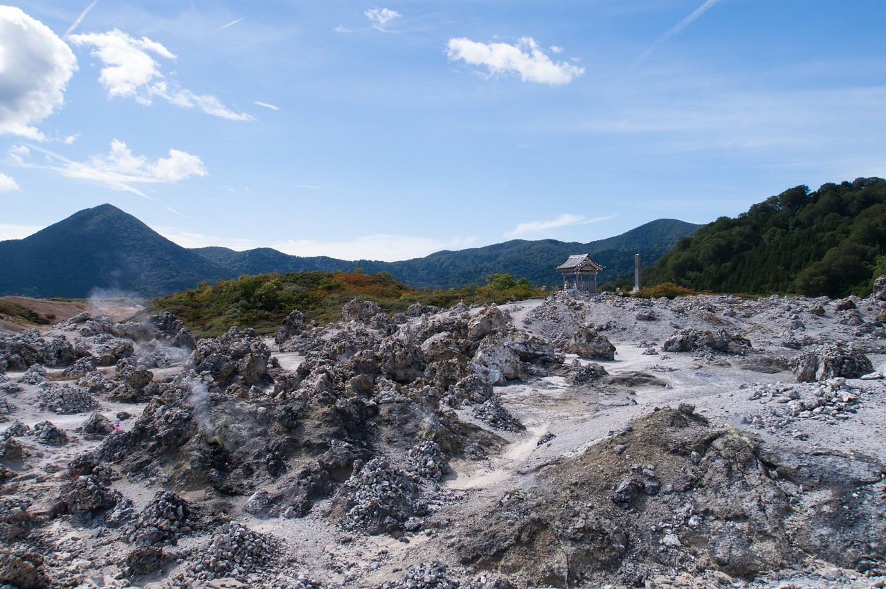 ภูเขาศักดิ์สิทธิ์โอะโซะเระซังตั้งอยู่บนแหลมชิโมะคิตะและเป็นหนึ่งในสามภูเขาศักดิ์สิทธิ์ร่วมกับภูเขาฮิเอะอิซังและภูเขาโคยะซัง วัดโอะโซะเระซังโบะไดจิสร้างขึ้นในปี 862 มีเรื่องเล่าต่อกันมาว่านักบวชจิคะคุไดชิเอ็นนินฝันเห็นนิมิตจึงสร้างวัด ""ยะมะเดะระ"" ขึ้นที่จังหวัดยะมะกะตะ จากนั้นก็มายังที่แห่งนี้และสร้าง ""วัดโอะโซะเระซังโบะไดจิ"" ขึ้นมา วัดโอะโซะเระซังโบะไดจิตั้งอยู่ริมทะเลสาบอุโซะริยามะซึ่งเป็นทะเลสาบปล่องภูเขาไฟ พื้นที่ศักดิ์สิทธิ์นี้ตั้งอยู่กลางขอบนอกของปล่องภูเขาไฟจึงอยู่ในจุดที่ถูกตัดขาดจนไม่สามารถมองจากภายนอกได้ ทั้งบริเวณมีแต่ทิวทัศน์แห้งแล้ง คนท้องถิ่นจึงเล่าต่อกันมาแต่โบราณว่า ""เมื่อตายแล้วก็จะไปที่ภูเขาโอะโซะเระซัง""