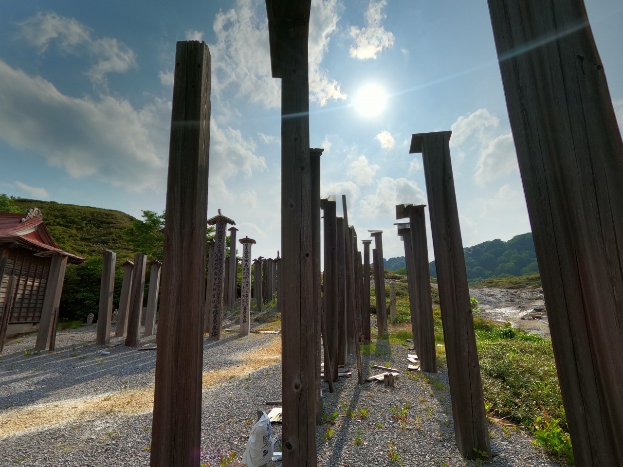 จะเข้าพื้นที่ศักดิ์สิทธิ์ได้ต้องข้ามสะพานไทโกะที่ทอดข้ามแม่น้ำซังซุ ภายในบริเวณวัดโอะโซะเระซังโบะไดจิเหมือนโลกหลังความตาย ไม่ว่าจะเป็นโกคุราคุฮามะที่งดงามประหนึ่งแดนสุขาวดี จิโกคุดานิที่อบอวลไปด้วยกลิ่นเหม็นของกำมะถัน อเวจี (นรกขุมสุดท้าย) หรือนรกบ่อเลือด และริมฝั่งแม่น้ำซังซุจะมีหินที่กองโดยพ่อและแม่หรือกังหันลมหมุนติ้วที่ตั้งไว้เพื่อแสดงความอาลัยอาวรณ์ให้กับบุตรที่จากไปตั้งแต่ยังเล็ก จนจะทำให้คุณรู้สึกเศร้าขึ้นมาอย่างบอกไม่ถูก