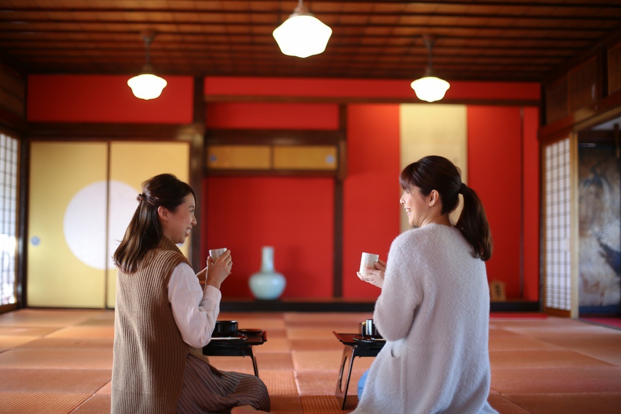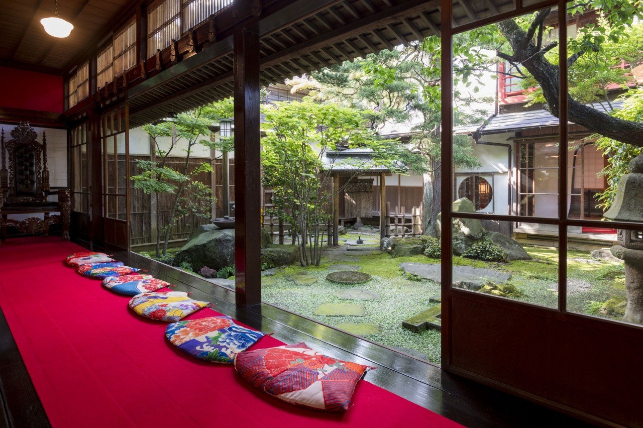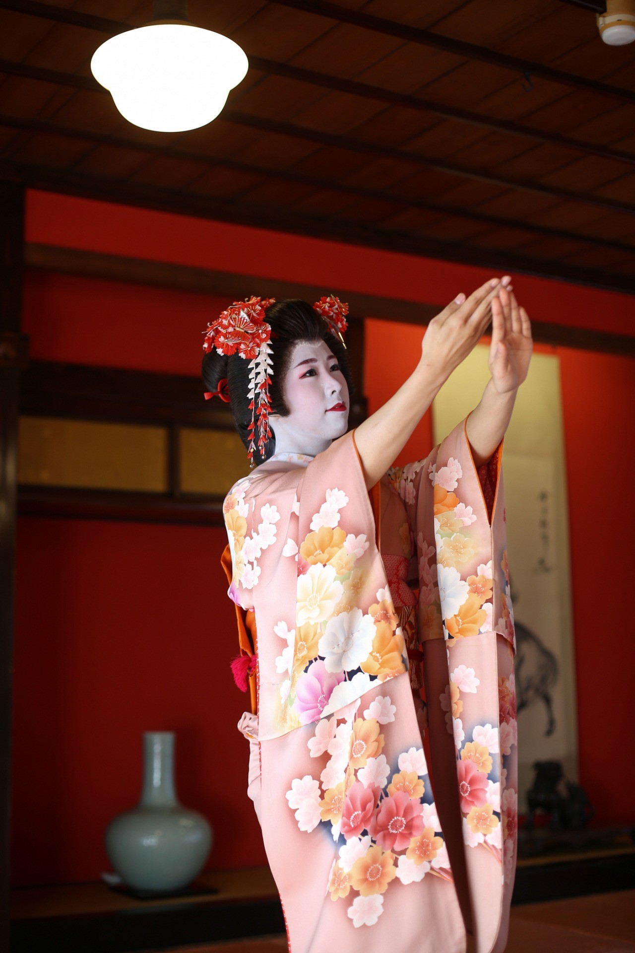 ห้องโถงขนาดใหญ่บนชั้นสองเป็นห้องแสดงของซากาตะ ไมโกะ สามารถชมการแสดงได้ทุกวันตั้งแต่เวลา 14.00 น. รายการประกอบด้วยสามเพลง รวมถึงเพลงซากาตะ จินกุ ซึ่งเป็นเพลงเกี่ยวกับสภาพของซากาตะเมื่อเต็มไปด้วยเรือคิตะมาเอะบุเนะ โปรดเพลิดเพลินไปกับการแสดงของนักเต้นที่มีเสน่ห์ให้จุใจ หลังจบงานคุณสามารถถ่ายรูปเป็นที่ระลึกกับไมโกะได้ ไมโกะโกเซ็นที่คุณสามารถเพลิดเพลินกับอาหารกลางวันไปพร้อมๆ กับการเต้นรำของซากาตะ ไมโกะก็เป็นที่นิยมเช่นกัน (ต้องจองล่วงหน้าอย่างน้อย 2 วัน) ที่ Maiko Cafe สถานที่ผ่อนคลายบนชั้น 1 คุณสามารถพักสมองขณะดื่มมัทฉะหรือกาแฟได้ หากคุณไม่สามารถชมการแสดงได้เนื่องจากเวลาจำกัด โปรดสั่งเครื่องดื่มที่นี่และถ่ายรูปเป็นที่ระลึกกับนักเต้น