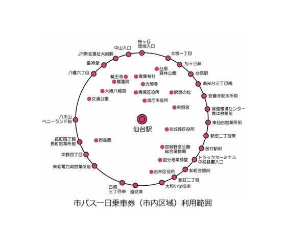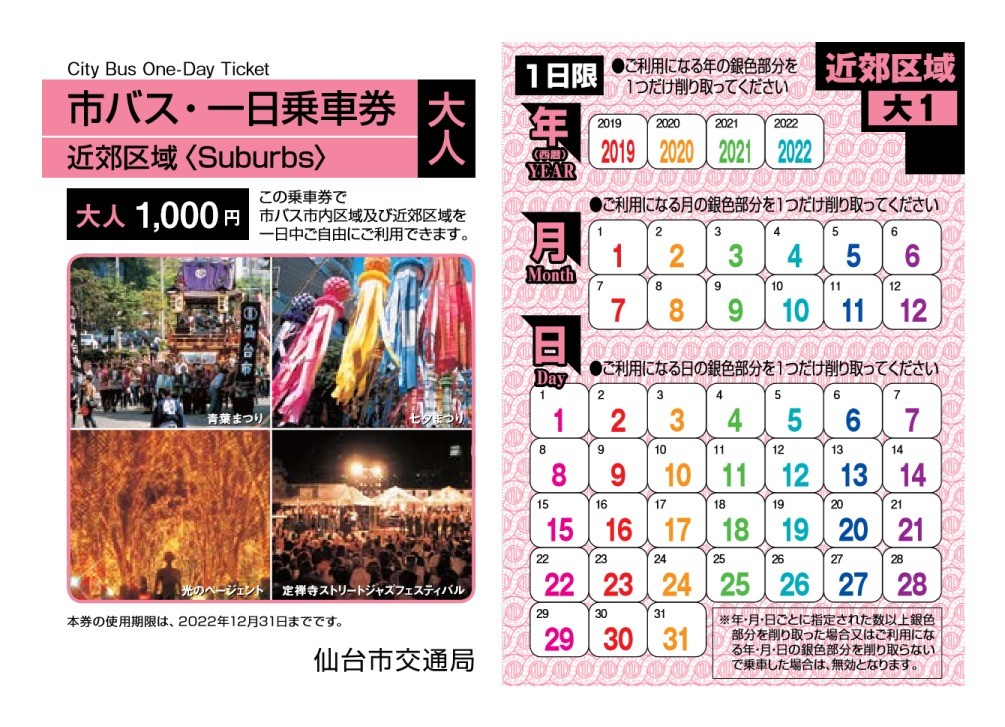 คุณสามารถขึ้นและลงรถบัสในเมืองได้อย่างอิสระทุกสายในเขตเมืองและทุกสายในเขตชานเมืองวันละกี่ครั้งก็ได้ตามต้องการ (ยกเว้น ลูปเซนไดและราคุเต็นชัทเทิ้ลบัส) ไม่จำหน่ายตั๋วบนรถบัสโปรดซื้อที่สำนักงานขายตั๋วโดยสารล่วงหน้า